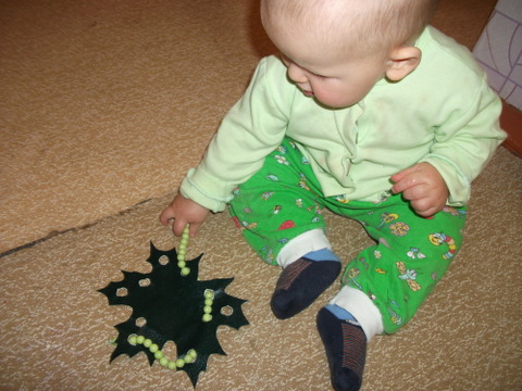 Все игры у нас в основном пока тактильные. И в этот раз познакомились с гусеничкой на листике. Листик вырезан из обложки тетради, а гусеничка из бусинок.