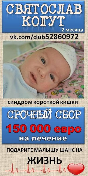 В жизни каждого человека главное - это семья. В молодой семье Когут очень ждали появления на свет маленького чуда - рождения ребеночка. В начале весны это чудо произошло - родился Святослав, Святик, как его ласково называют мама и папа. Молодую маму и малыша выписали домой. Но счастье длилось недолго... Уже через две недели над семьей стали сгущаться тучи... Малыш стал недомогать.. Больница... Снова дома... Опять больница... Святик пережил две сложнейшие операции. Вопреки прогнозам врачей маленькое сердечко продолжает биться. Малыш находится в реанимации, он не может усваивать пищу. В Беларуси ему помочь не могут, необходимо дорогостоящее лечение в Германии (около 150 000 евро за 6-8 месяцев лечения). Университетская клиника г.Маннхайм готова принять Святослава в сентябре!