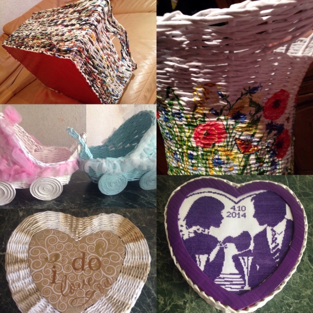 Верхняя коробка из журнальных страниц. Газеты-идеальны по толщине. Когда-то увидев в нете плетеные вещицы, я подумала: нечего людям делать, потом эта мысль меня не отпускала месяц и я решила сама попробовать, а газет-то дома и нету. По всем соседям прошла, их макулатурные заначки потревожила:) от газет руки сильно пачкаются и летит эта цинковая пыль и дышишь- от них отказалась. потом рекламки из супермаркетов понравились, жалко, нет у меня фоток тех корзинок-все раздарила. А потом у нас была тема свадьбы актуальна( дочка собралась взамуж),вот и плела коробочку с вышивкой на крышке для открыточек и колясочки для сбор средств на мальчика-девочку. Как показала жизнь, кто плел-тому и Щастя: доча моя взамуже нажилась полгода, а я и замуж вышла во второй раз и Маргошку родила