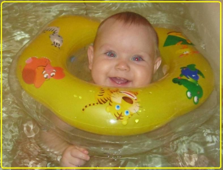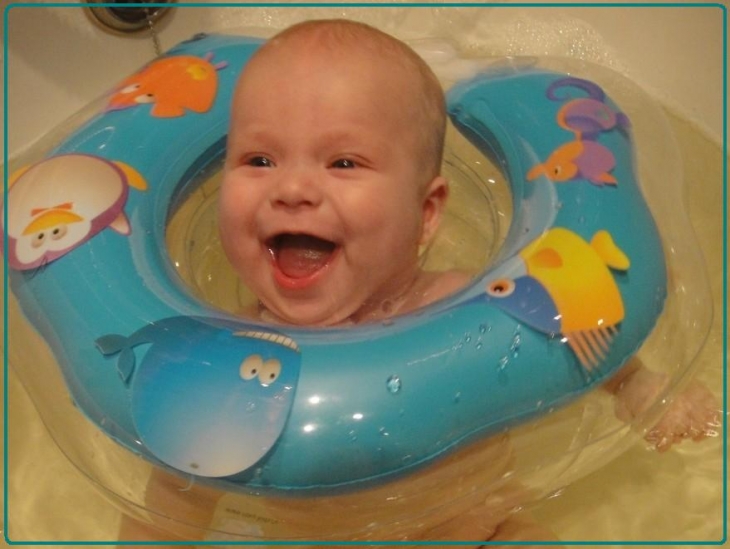 8. Погремушки! Три разноцветных шара-погремушки не отвлекают во время плавания, зато прекрасно привлекают внимание малыша при первом ознакомлении. Известно также много случаев когда родители используют круг как большую и красивую погремушку, для отвлечения ребенка (когда заплакал или во время одевания-раздевания малыша).