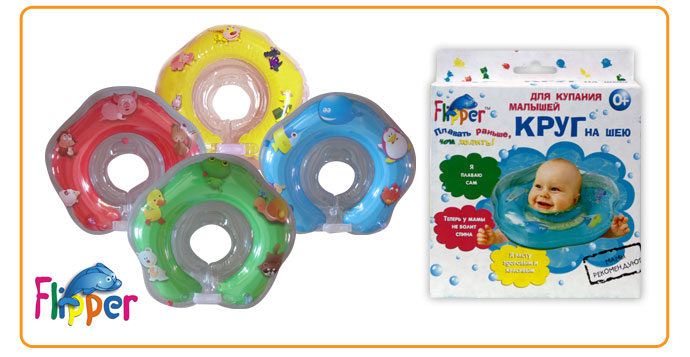 сийская компания РОКСИ совместно со швейцарскими специалистами разработала надувной круг на шею для плавания и купания малышей под торговой маркой «Flipper».