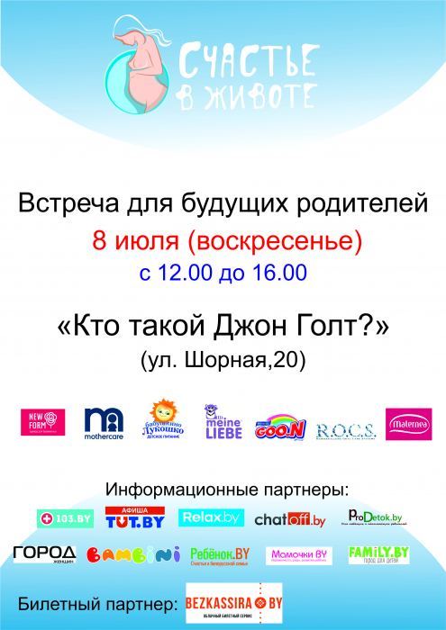 8 июля (воскресенье) с 12 до 16 часов в свободном пространстве Кто такой Джон Голт? (ул.Шорная,20) пройдет очередная встреча проекта для настоящих и будущих мам Счастье в животе. Вас ждут неформальное общение, вкусные угощения, конкурсы с призами и подарками и, конечно же, ответы на самые часто задаваемые вопросы от лучших экспертов. Приглашеннные эксперты встречи: