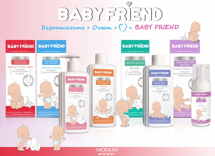 Чтобы помочь родителям в подборе оптимального набора средств для самого дорогого человечка в их жизни, СОАО «Парфюмерно-косметическая фабрика «Модум-наша косметика» совместно с врачами-педиатрами разработала серию BABY FRIEND. Эффективность средств из этой серии доказана клиническими испытаниями.