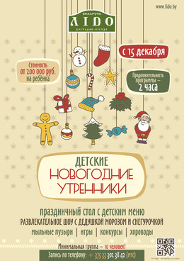 С 15 декабря в кафе «ЛИДО» возле Комаровки можно заказать новогодний утренник. Количество участников – 10 человек. Это могут быть ваши друзья или дети, с которыми ребенок ходит в детский сад или школу. Время проведения и дата оговаривается с администрацией заранее. Программа праздника подразумевает стол с детским меню, развлекательное шоу с Дедом Морозом и Снегурочкой, шоу мыльных пузырей, игры, танцы и хороводы.