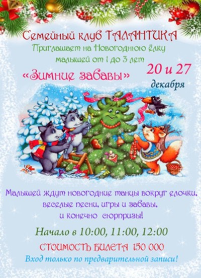 Малышей от годика в детском клубе «Талантика» ждет свой маленький утренник «Зимние забавы». Опытные и квалифицированные педагоги подготовили специальную программу для малышей с учетом возраста. Однако каждый сможет побегать, потанцевать, поводить хоровод вокруг елки и весело посмеяться от души. Каждый участник утренника получит подарок.