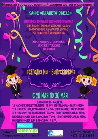 Минский государственный Дворец детей и молодежи приглашает девчонок и мальчишек, а также их родителей принять участие в интерактивных шоу-программах для воспитанников детских садов, выпускников начальной школы 29, 30 мая. «Сегодня мы – выпускники!» — это настоящая детективная историю с неожиданными поворотами событий и непредсказуемым финалом, звездная дискотека и вкусное угощение, которое никого не оставит равнодушным.