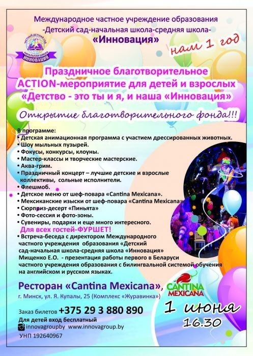 1 июня международный частный детский сад-школа «Инновация» приглашает детей и взрослых на свой первый день рождения. Всех гостей благотворительного праздника ждет интересная и разнообразная программа, много подарков, и веселых конкурсов. Начало в 16.30.
