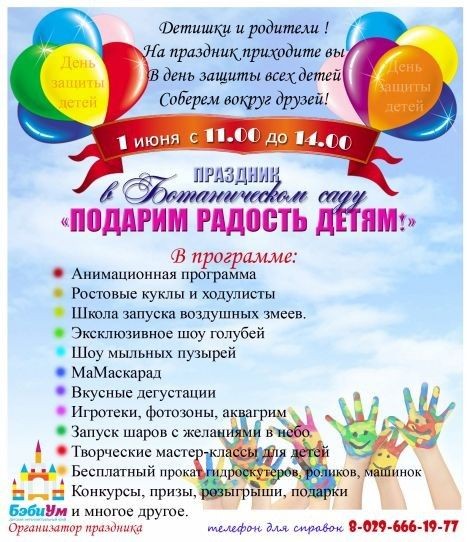 1 июня — Международный день защиты детей! Самое время уделить внимание своим детям и посетить праздник «Подарим радость детям!», который пройдет в Ботаническом саду с 11.00