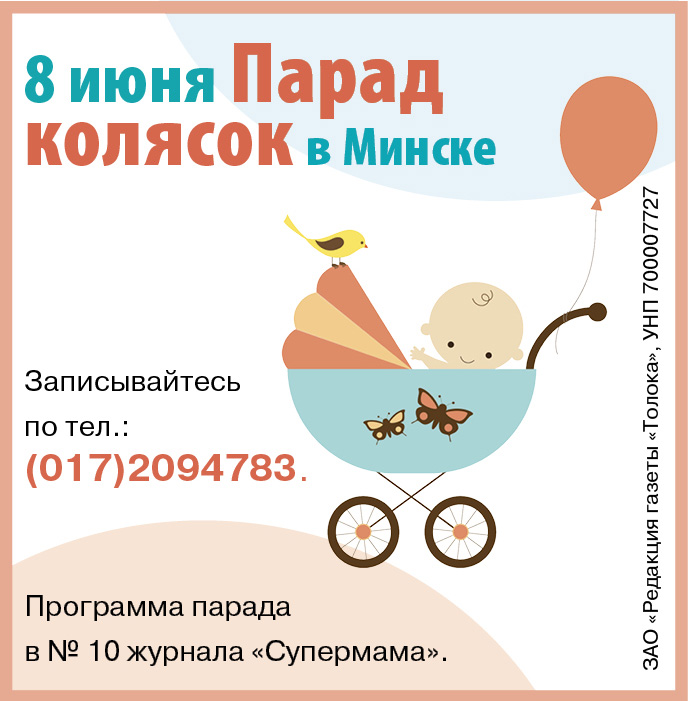 8 июня журнал «Супермама» приглашает пап и мам на Парад колясок в Минске. В этом году все участники торжественно проедут по главной аллее, а награждение пройдет у главных ворот парка Горького.