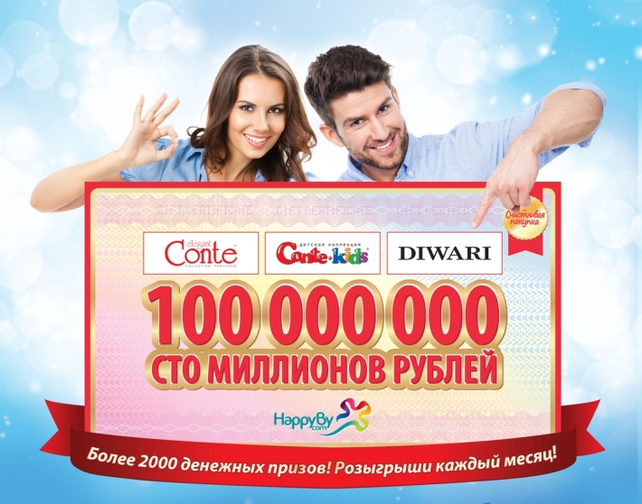 С радостью мы объявляем о начале очередной рекламной игры «Счастливая покупка – 4»! Стать обладателем миллионов проще, чем вы думаете: достаточно любить «Conte» и активно принимать участие в нашей рекламной игре. Возможно, именно вы станете новым обладателем главных призов – 100 000 000 рублей!