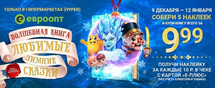 Специально к Новому году «Евроопт» спешит поздравить своих покупателей и предлагает волшебный подарок под елку – уникальный сборник «Любимые зимние сказки» – всего за 9,99 рублей.